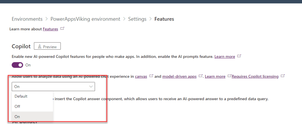 Under Features is where you can allow users to interact with data in your model-driven apps. You enable this by setting the “Allow users to analyze data using AI-powered chat experience” option to “Yes”. The other Copilot settings are related to using co-pilot for creating apps.