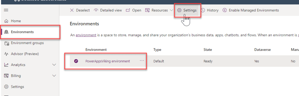 First step is to add the feature itself. This is done by going to the admin center (admin.powerplatform.com) and navigating to the environment that should have the feature enabled.