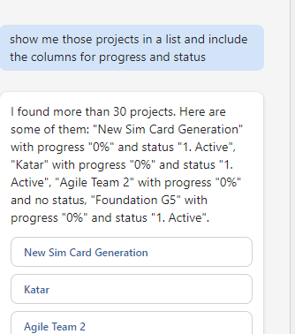 Now the first thing you would typically ask is probably very filter/list oriented. But the real magic lies in the ability of Copilot to further drill-down or assess the results in a conversation. An example could be asking Copilot to tell you what the type of data a query would bring you. Then a follow-up question could be to provide a list with certain columns included such as this example: