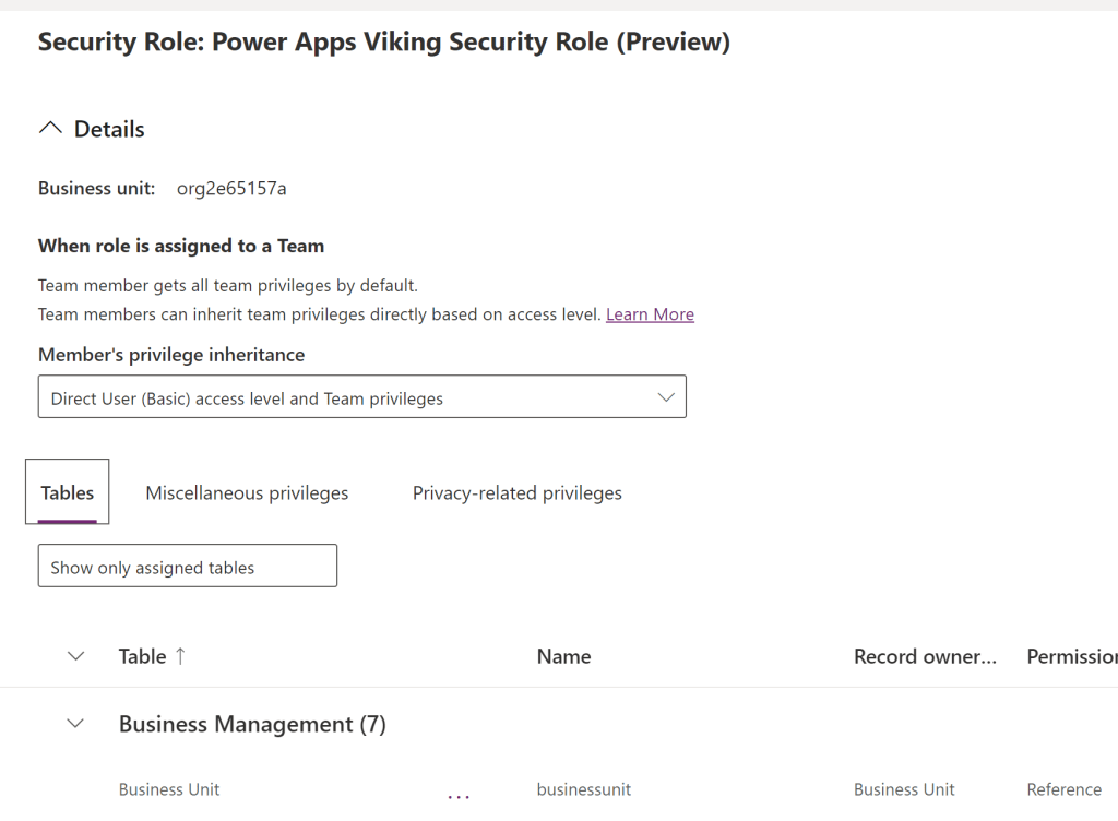 From here you want to give the security role a name and select which business unit the security role belongs to. The reason for selecting a business unit is that you can divide different roles into different units. I see this done in very few actual cases as security is usually synchronized with Entra ID groups, instead of a company managing the organization in dynamics as well, but the use case still stands. Also, be aware that you cannot include a security rule belonging to a child business unit in your solution. This is because the business units are unique for each environment. The Security role therefore needs to be created on the parent business unit level. You will still be able to enact security on the business unit level, but you will need to manage the business units on the individual environments.